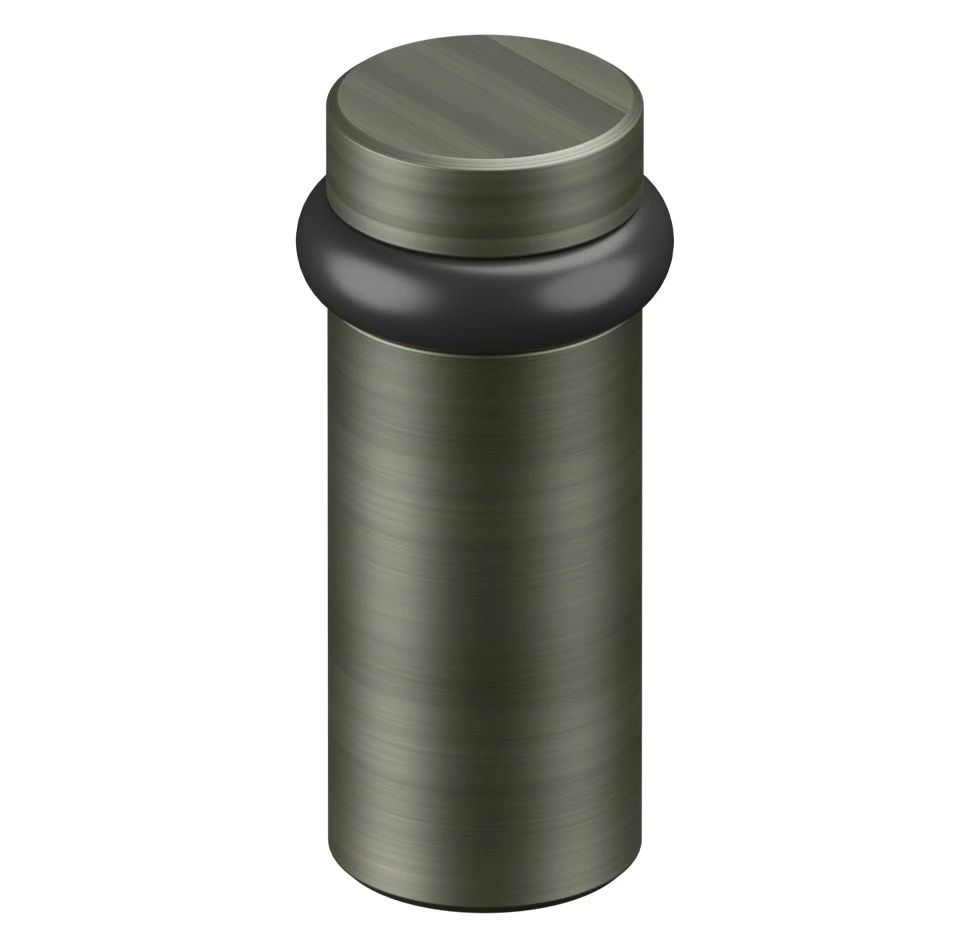 - Universal floor mount door stop constructed of solid brass and finished in antique nickel.