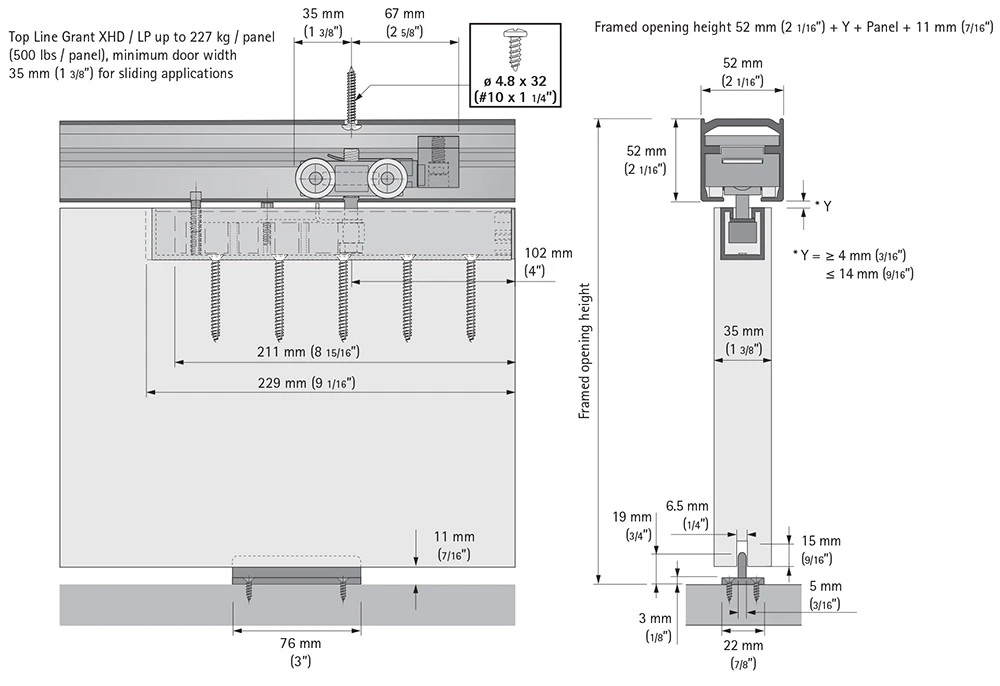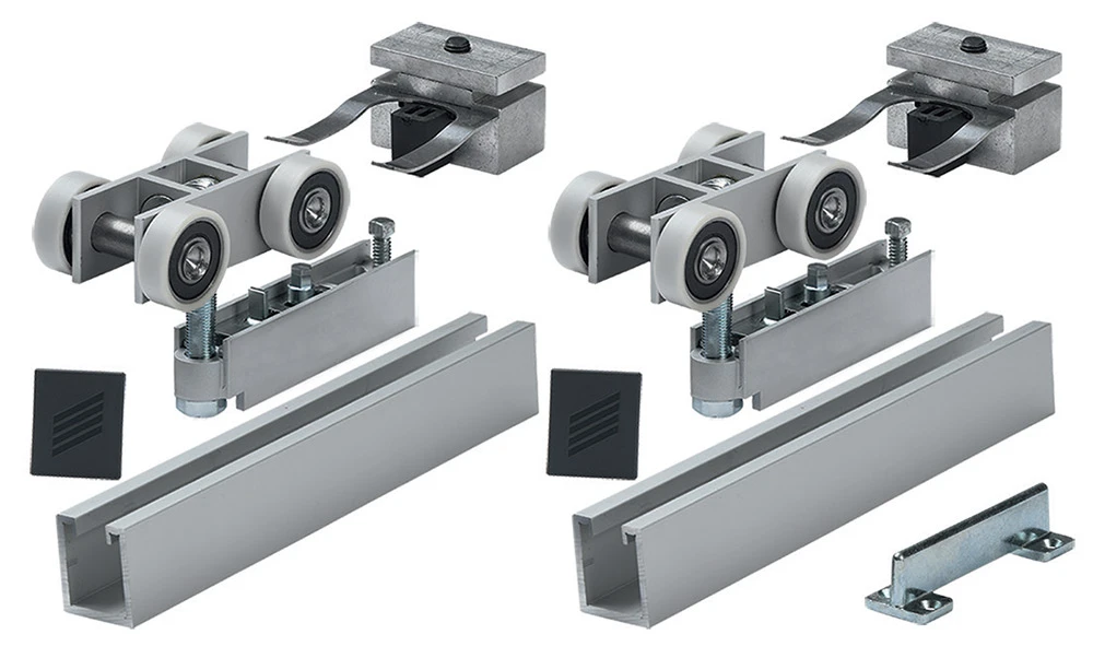 - Top Line Grant XHD Series Low Profile Hardware Set Includes: (2ea) low-profile, four-wheel ball-bearing carrier assemblies with door channels, support inserts, and end caps, (2ea) aluminum top plates, (2ea) endstop catch, (1ea) 7015 floor guide, screws and installation instructions.